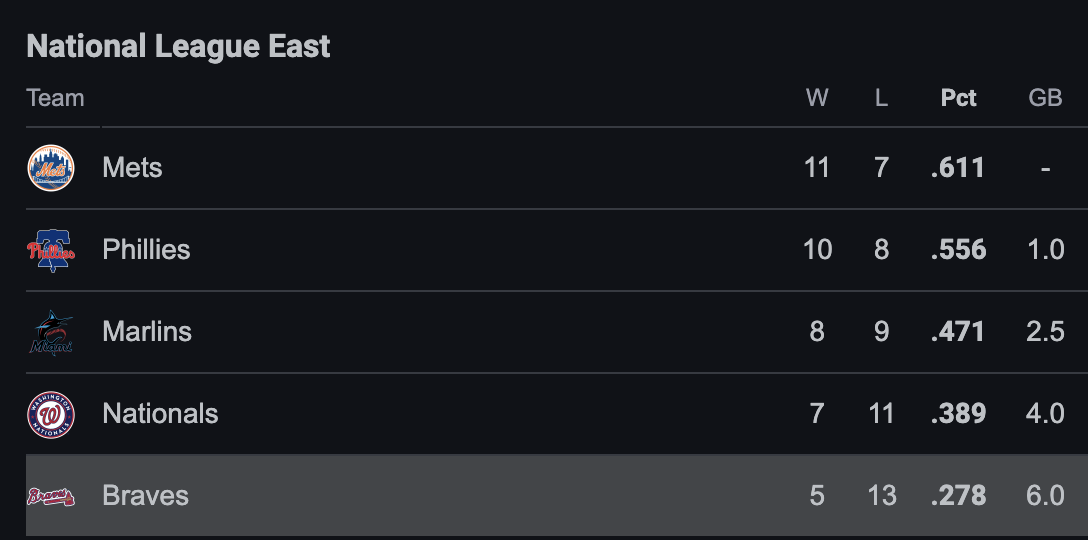 The Braves are still in a rut. They just lost back to back series and sit in the dog house of the NL East. They’re 5-6 since they started 0-7. The only thing scoring are their announcers. Sure they just wiped the floor with the Phillies at home, but they’re 2-11 on the road. Wait til the Phils give them a taste of their own medicine when they come into the Bank. The Braves might’ve dug themselves too much of a hole early in the tough NL even with the return of Spencer Strider and Ronald Acuna Jr. in the foreseeable future.