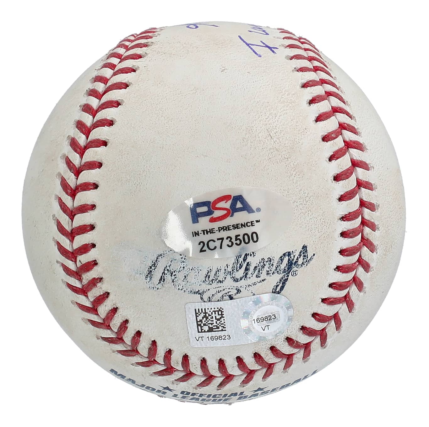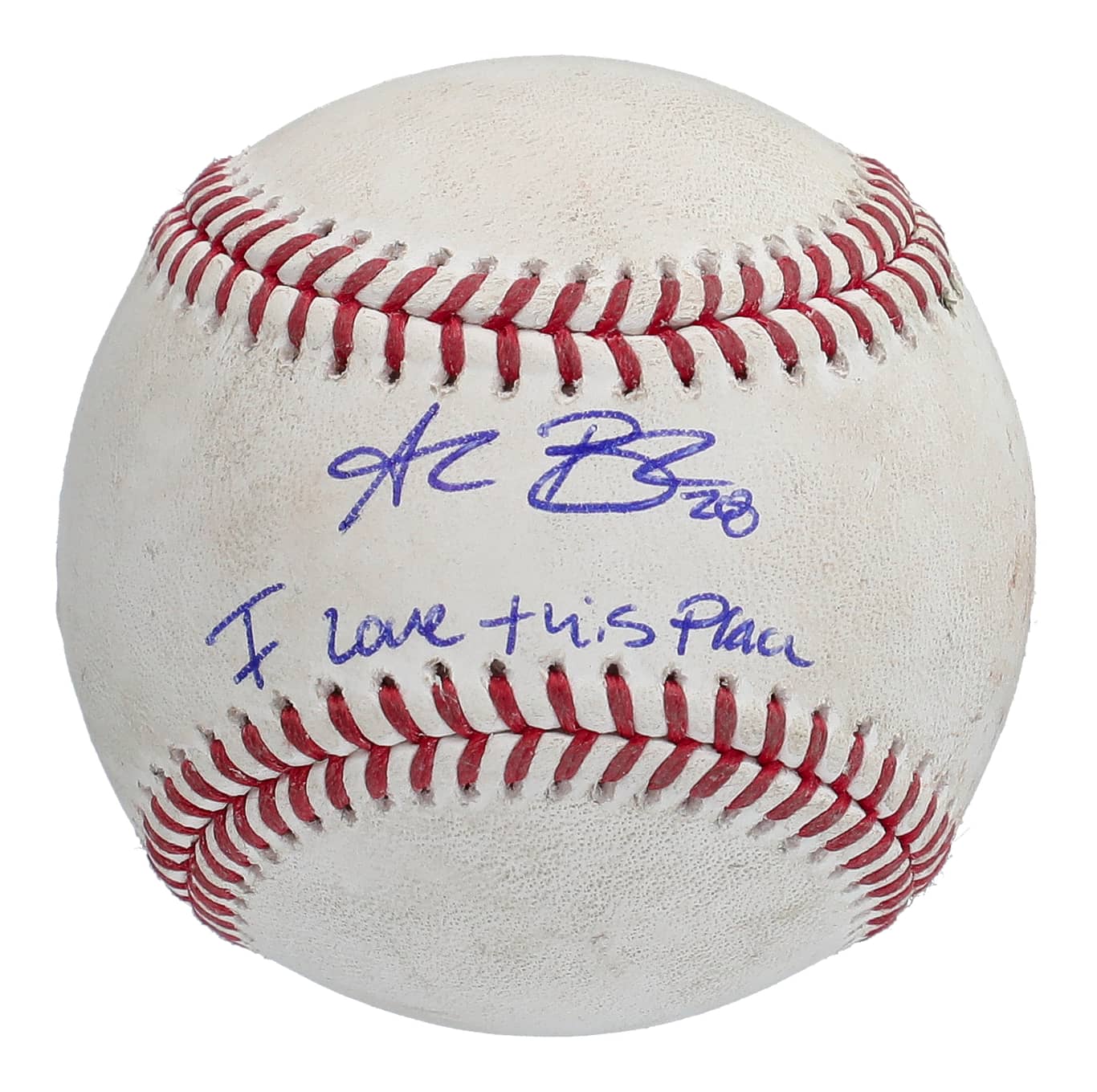 Presented is the actual official Major League Rob Manfred Jr. baseball used in that Apr. 11, 2022 game when Alec Bohm committed his third error of the game in three innings. Bohm has penned his flowing signature in blue ink across the baseball’s sweet spot, adding the inscription “I Love This Place” in atonement for controversial—and yet light-hearted—quip of frustration following the error. The baseball exhibits excellent game use and comes with an MLB Authenticated Hologram (VT169823) for game use, plus a COA from PSA/DNA (2C73500) for signature.