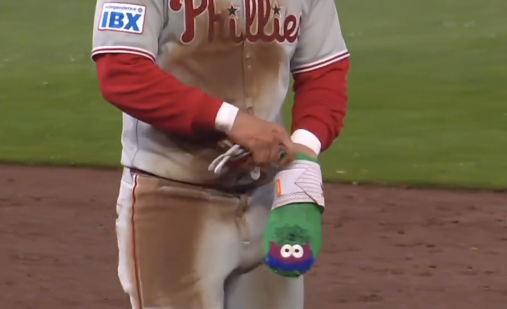 Last night, Bryce Harper got on base and put on his Phillie Phanatic oven mitt like he typically does. Don’t tell that to Braves announcers though who thought it was Oscar the Grouch: