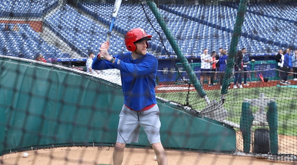 Yeah, not great. It’s actually not a terrible swing–if you’re playing co-ed weeknight softball. To be fair, it’s obvious that Kyle knows how to swing the bat a little bit and was probably pretty decent at some point, probably when Bryce Harper was in pre-school. I’ll even concede that from a timing standpoint, it’s actually difficult to hit off a pitching machine, especially when you haven’t swung a bat in over 2,000 days. That said, there’s a lot going on here and most of it is no good.
