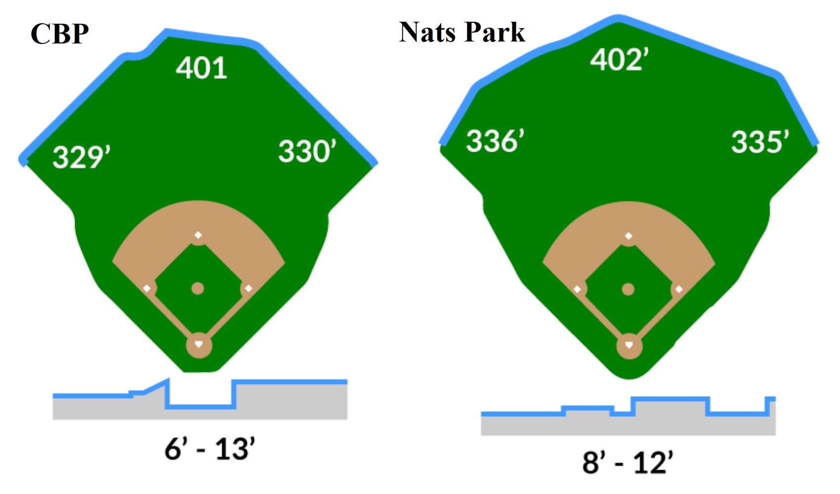 In 2018, CBP had the fourth-best home run PF in Major League Baseball. Citizens Bank Park is shorter in the corners than Nationals Park by several feet, with different wall heights, as you can see after the jump:
