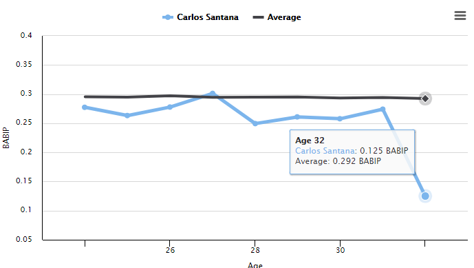 When things fall off a cliff like that in a relatively small sample size, it means either the player’s skills have completed eroded, or he’s experiencing a shit ton of bad luck. It’s entirely possible he’s experiencing some regression as he enters his mid-30’s, but I’m willing to wager that what you’re seeing is more a product of the fact that the guy has just gotten boned this season.