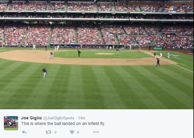 Baseball is back in Philadelphia. How do we know? Because the umpires blew a basic call that could not be overturned by a challenge and confused everyone at the ballpark for ten minutes. With the bases loaded, Darin Ruf’s pop-up started to carry into the outfield. Padres shortstop Alexei Ramirez never had his footing under the ball, and it dropped to the outfield grass. It was called an infield fly. A run scored on the play, but Ruf was called out. Here’s how it looked: