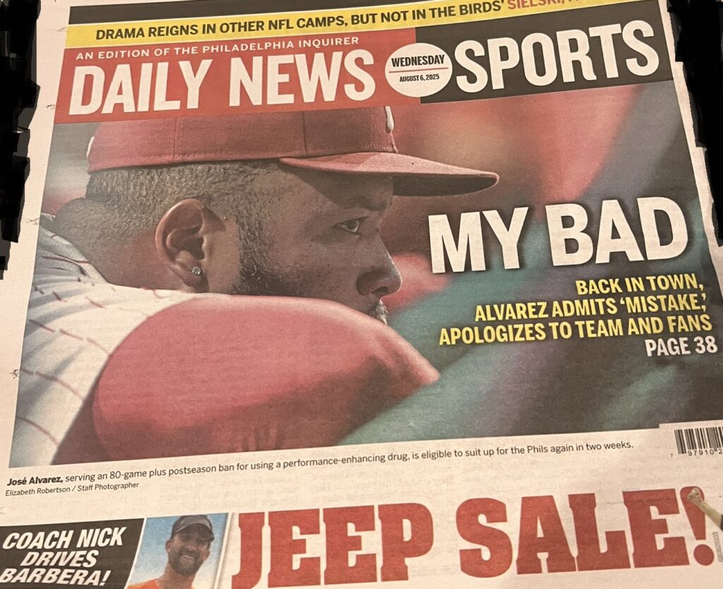 The back page of Wednesday’s Daily News features suspended Phillies reliever “Jose Alvarez,” not to be confused with Venezuelan lefty Jose Alvarado: