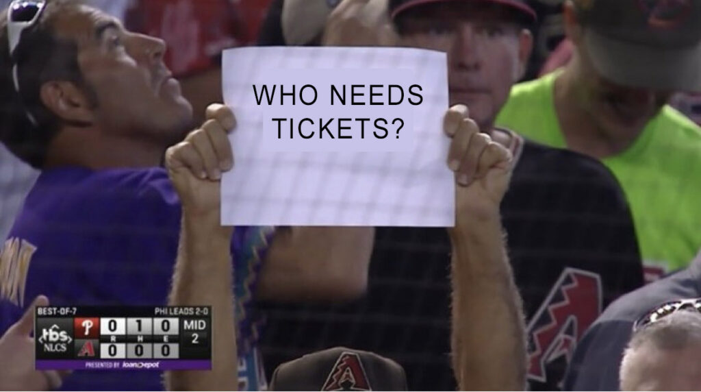 Every tweet I saw was of Phillies fans buying tickets in the $9-$20 range. I didn’t see anyone blowing money on tickets behind the dugout they weren’t going to use. Here’s a solution: Get a better fanbase. Have some pride in your team. Your fans handed us an opportunity to make you look like a fool and we took it. They can’t fork over nine bucks while debt collectors in Philadelphia are licking their chops knowing business is going to be BOOMING in a couple months. TBS continues to claim there are 50,000 people at Chase currently. Maybe in paid attendance: