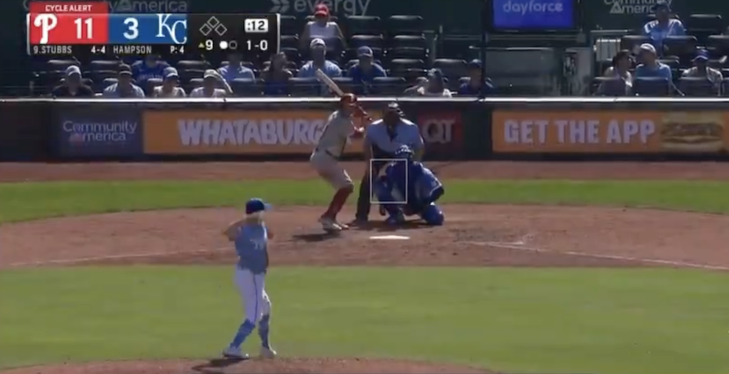 I love how RAJ is like, “He’s gotta get out of the way!” Real easy to say that 100 yards away in an air-conditioned booth. Did you see the movement on that heater? Do you know how locked in Stubbs probably was? Not to mention it was like 100° in Kansas City. The guy was probably seeing double. We’re in the 9th inning after he caught a game with 10 pounds of extra gear on him. The amount of electrolytes he lost would probably get a small child rushed to CHOP. He’s a borderline hero for what he was able to grind out.