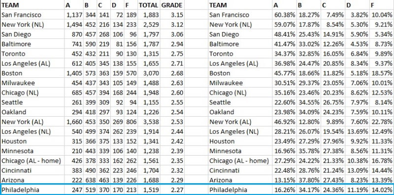 1,519 fans offered up a grade on the team of McCarthy, Ben Davis, John Kruk, and Mike Schmidt. Only 247 graded the group as an “A,” while 519 gave them a “B” and 370 went with a “C.” That averages out to a 2.27 score and a spot just inside the top-20 on the list.