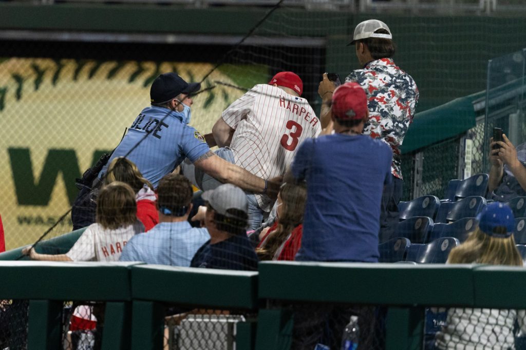 There’s a theme. ANOTHER fan leaps over the wall at the @phillies. This dude slid into 2B then hit the security guard with a stutter step. pic.twitter.com/s1AGHjvXC1