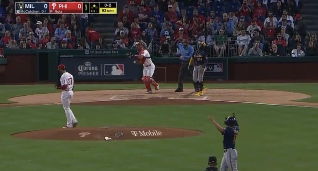 Kyle Schwarber led off the fifth inning with a double to give the Phillies their first runner in scoring position since the third inning of Saturday’s loss, ending a span of 10 innings. A few batters later, Jean Segura came to the plate and took this pitch for a strike: