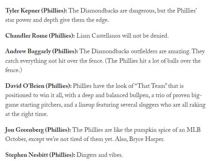 So in a small sampling of three stories, ESPN, FOX, and The Athletic, that’s 35 writers picking the Phillies and one picking the Diamondbacks.