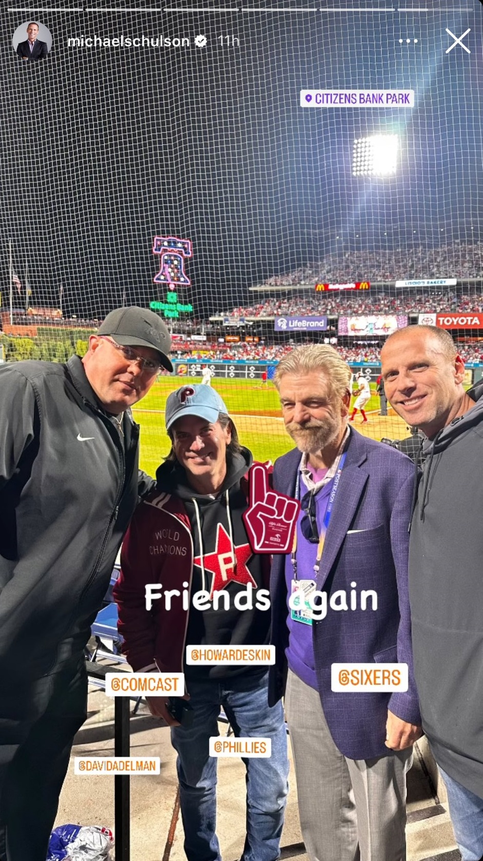 What a group that is. From left to right, it’s Eagles security boss Dom DiSandro, Sixers co-owner David Adelman, Howard “The Burger King” Eskin (wearing his press pass), and Schulson.