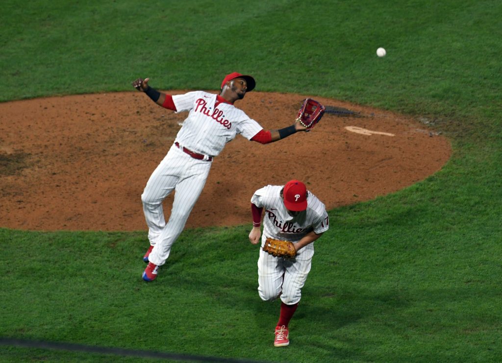 1. Rhys Hoskins should have taken charge and caught the ball.