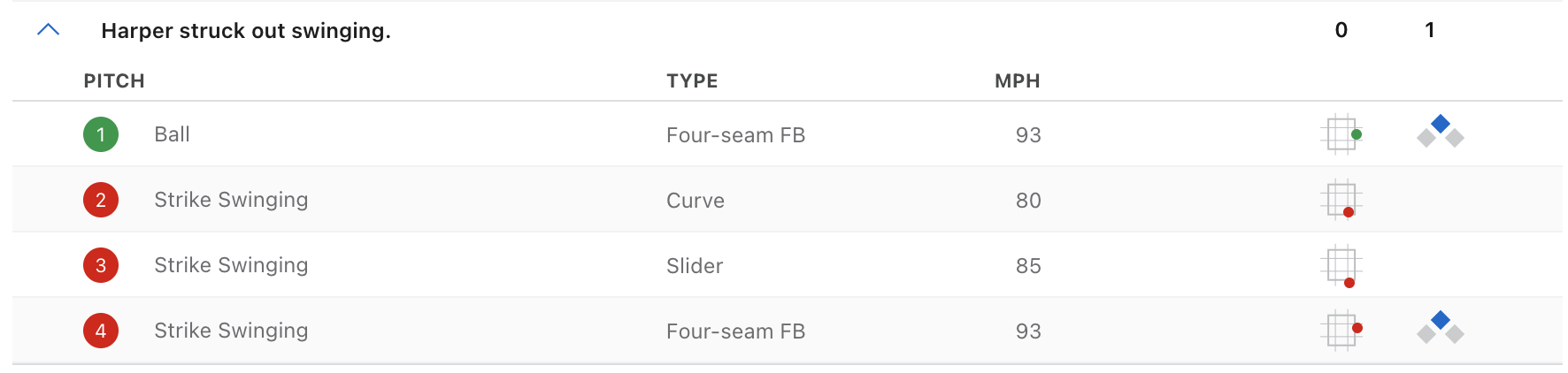 Nick Castellanos got his first hit in a postseason game since Game 2 of the 2023 NLCS. Trea is 0-16 in his last four playoff games. Those games started at 5:07 (in a dome), 5:07, and 8:07. That second 5:07 game had the sunset at 6:10pm in Philadelphia. Yes, I’m so pissed off at these guys about I’m researching atmospheric physics to own Trea Turner. Because these are the two most important guys in the lineup. They protect Bryce Harper and they’re complaining about the sun. Bryce’s first two at bats he saw one strike. His third at bat, a strike out, he barely saw a pitch in the box: