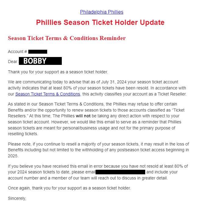 At the bottom of the email, which came from “feedback@mail.mlbemail.com,” it says “you received this message as a Phillies Season Ticket Holder.”