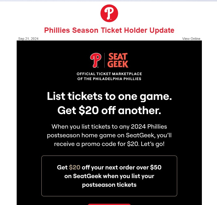 A Phillies fan forwarded me an email they received this past Saturday. The subject line said “Get a $20 promo code when you list your MLB tickets,” and the email body looked like this: