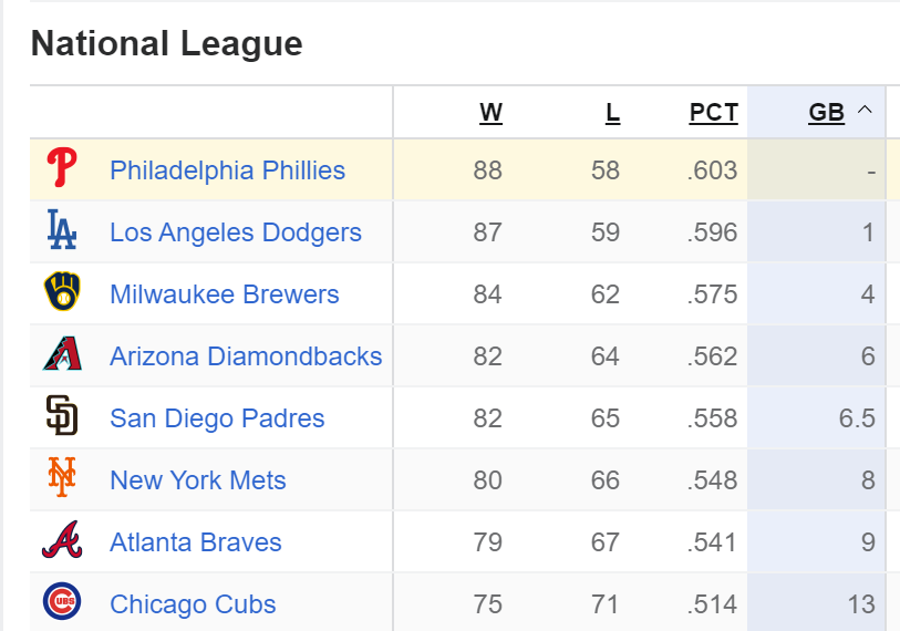 The Phillies hold a one-game lead over the Dodgers for the #1 seed, but it’s really a two-game lead due to the season series tiebreaker, which the Phillies own. After the Dodgers are the Brewers, who trail the Phillies by three games in the league race.