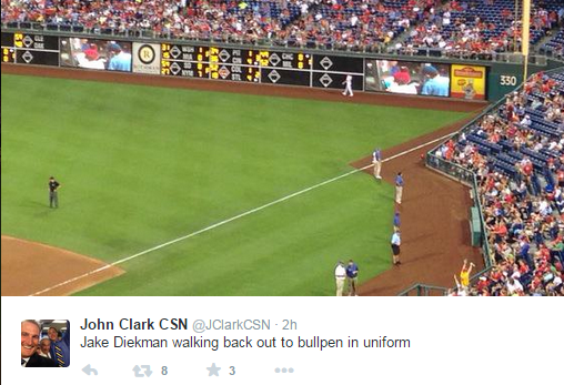 When the Cole Hamels trade became unofficially official on Wednesday night, Jake Diekman had been added to the Rangers’ haul. Hamels isn’t going to pitch for the Phillies again. Neither is Diekman. But since the trade isn’t 100% official yet – the particulars are being hammered out – both Hamels and Diekman had lockers at Citizens Bank Park set up tonight. The weird thing is, Diekman was there, got dressed, warmed up in the outfield, and took his place in the bullpen. And then he left. And then he went back. It was incredibly awkward. Diekman himself doesn’t seem to really know what’s going on: