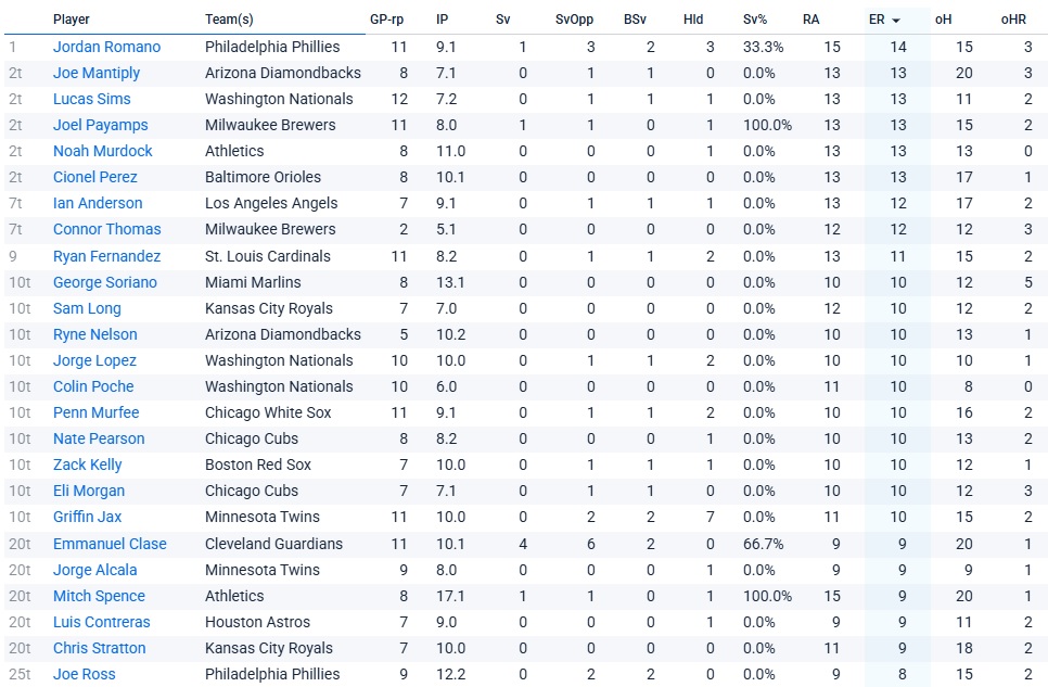 His ERA has ballooned to 13.50 with two blown saves and the Sportradar data shows he’s now tied with Oakland’s Mitch Spence for the most runs given up among all Major League Baseball receivers: