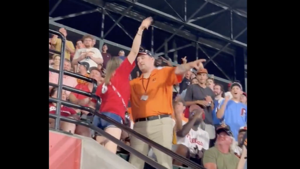 I love that lady getting her pound of flesh before they removed her. Get your money’s worth, hon! I know you’re the one being unfairly (maybe) ejected. I’m sure there were some white trash O’s fans from Hagerstown and Frederick up there giving it to you the entire time. For some reason Phillies fans absolutely love launching cell phones. It’s like a kink: