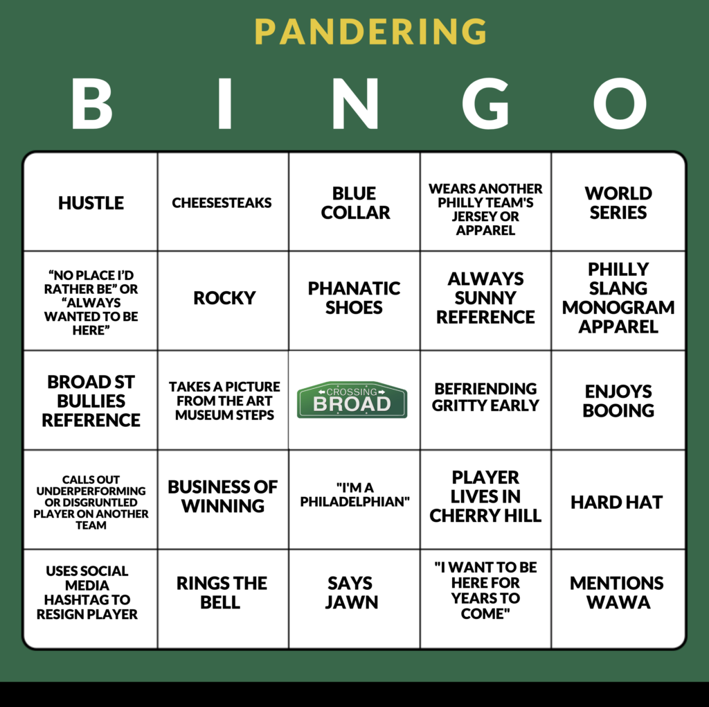 After Kyle Schwarber talked about the “business of winning” and cheesesteaks in his first press conference as a Phil, we had to make a Pandering BINGO board for Nick Castellanos. Here is what we were working with going into Wednesday: