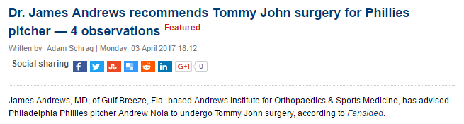 Dr. James Andrews, the world’s only doctor, did give Nola a platelet-rich plasma injection after the righty was shut down last season, but Nola is said to be 100% and pain-free as the 2017 season gets underway. It would have satisfied Kyle’s prediction, though.