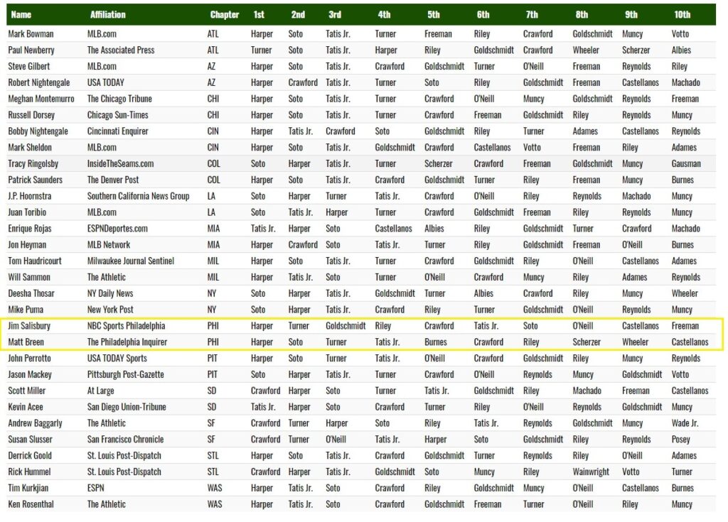 And just to be fair and show I have some integrity (something Derrick Goold would know nothing about). I’ll call out longtime Phillies writer Jim Salisbury, who had one of the dumbest MVP ballots this country has ever seen, when he slotted Juan Soto in 7th place the year Bryce Harper won his second MVP award: