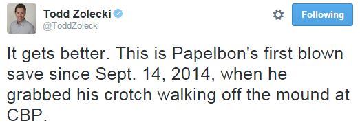 Last night, Jonathan Papelbon allowed a game-tying home run to Freddy Galvis, marking his first blown save in a full year. To the day. And what was so special about that last blown save? He grabbed his dick afterwards.