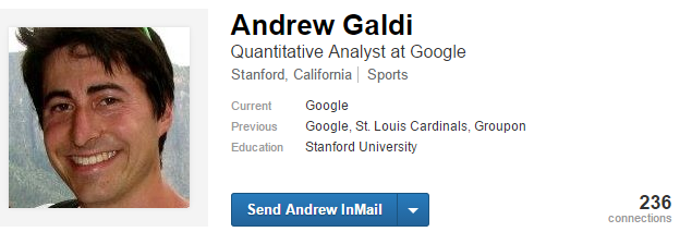 Galdi, before Google, worked as a Baseball Operations Analyst for the St. Louis Cardinals on a part-time basis. He also spent two years working as an Officiating Analyst with the NBA, where he actually did pretty impressive things, if you’re a nerd: