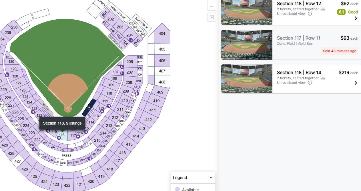 We know the Rays have no fans and play in a joke stadium, and the Twins haven’t won a playoff GAME, let alone a series, since 2004, when Johan Santana was turning into a star. It’s been that long. But the Brewers ticket prices are crazy. I double checked a couple of other resale outlets, and the Stubhub get-in price is $7 each for a couple of tickets in the top section. I thought Milwaukee fans were decent, but maybe not. It’s a 5:08 p.m. start, their time, and tickets are super cheap. There are seats right behind home plate for less than $100: