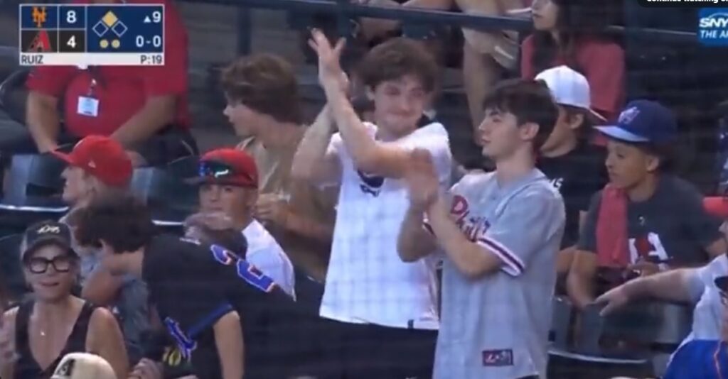 Can’t tell what player is on the back of this kid’s jersey, but he’s wearing Phils gear at a D-Backs/Mets game in Arizona, which is atypical. Perhaps he just loves baseball in general, like when Rob Lowe wore the hat bearing the generic NFL logo. Or maybe this kid has Lindor on his fantasy team or is a Collegeville Italian Bakery employee. OR maybe these two goofballs are being sardonic and doing some kind of Lindor mockery here.