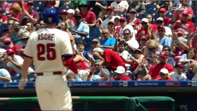 When you’re sitting as close as you possibly can to a baseball game, just keep your eye on things flying directly at your face. Generally, that’s a good strategy. Cody Asche’s flying bat just missed this fan’s face, and she’s still sitting in the first row in the 5th inning, probably paying a bit more attention.