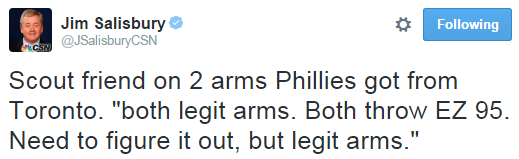 UPDATE: Jim Salisbury is hearing (confirmed by Ken Rosenthal) that the Phillies got two pitchers in return: Jimmy Cordero and Alberto Tirado. Tirado is ranked as the Blue Jays’ 9th best prospect by MLB.com. Cordero isn’t in the top 30 on MLB.com.