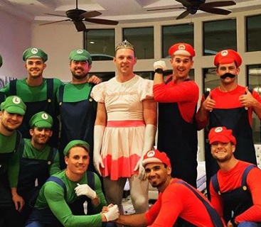 Looks like Rhys Hoskins is dressed up as Princess Toadstool here for his bachelor party. There are 12 dudes and 11 of them are costumed as Mario or Luigi: