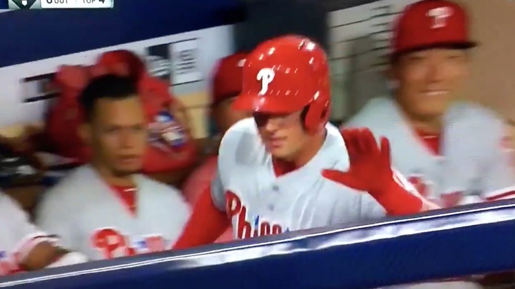 You can judge a man on the way they react to unexpected awkwardness. I, for example, facing the prospect of a strange encounter, freeze up like a fainting goat and look down at my all-consuming connected light device, my iPhone. But not Rhys Hoskins. Oh no– perhaps with a bit of forethought, the Phillies rookie played it off so well after hitting his first Major League home run: