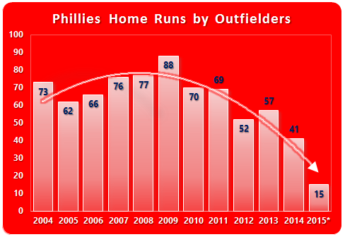 In the short history of Citizens Bank Park, the Phillies have never had an outfield this powerless. See the graph. The current incarnation is on pace to blast (“blast”?) 15 home runs. That’s down from last year’s Marlon Byrd driven 41. Beyond the last two years, the number never dipped below 50 at CBP.