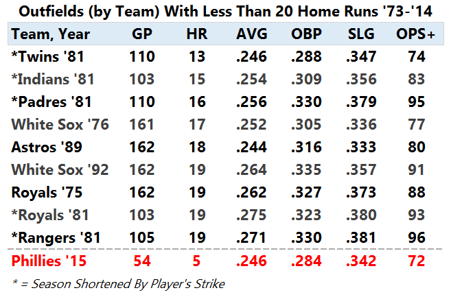 This group of Phillies outfielders — the group Dom Brown isn’t good enough to be a part of — is headed toward a terrible 72 OPS+. None of the other teams with outfields that totaled less than 20 home runs in a season have been that poor offensively.