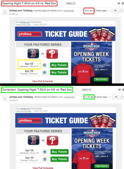 The Phillies sent an email today promoting their Opening Week series against the Red Sox (for which tickets are dirt cheap at Crossing Broad Tickets). They misfired.