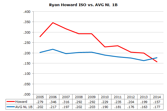 The above chart, via Crashburn Alley, shows Howard’s “isolated power” numbers — slugging percentage minus batting average — over the past nine seasons. There’s a trend there. That trend is down, down, down. Last year, at least via this one statistic, Howard officially became a below average hitter at his position. If you’re looking for power and don’t care about batting average, Ryan Howard isn’t your best option for the money. Bill Baer at Crashburn Alley continues: