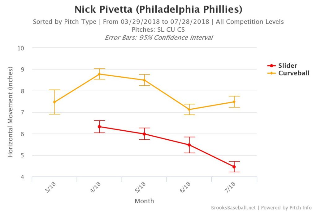 Yeah, I know. But follow me for a minute. What these charts illustrate is a significant decrease in both the horizontal movement and vertical drop of his breaking pitches. In the case of the vertical movement shown on the second chart, the upward trajectory of that line isn’t good. What were tight breaking pitches with above league average movement early in the season have recently flattened out. There are a few possible explanations for this. Mechanics, grip, fatigue, or injury are each possibilities, but given his excellent velocity, this doesn’t seem like a health-related issue. Whatever the cause, getting the bite back on his breaking pitches will be integral to Pivetta’s success down the stretch.