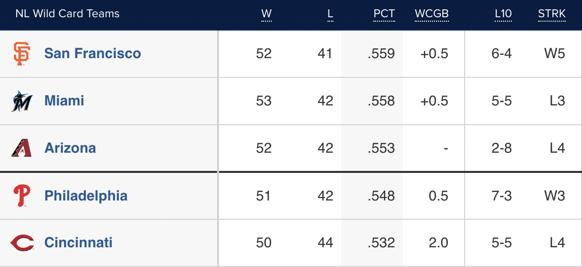 They remain 0.5 games out of the final wild card spot, but they are also only one game out the top wild card spot. Brutal weekends for the Diamondbacks, Reds, and Marlins.