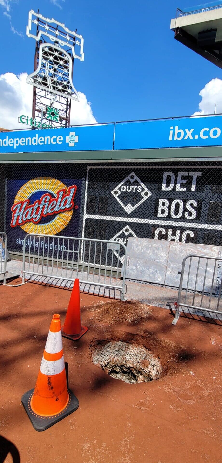 UPDATE: A source close to the situation tells Crossing Broad there was not a sinkhole in centerfield, but a hole was created due to a burst pipe underground that has since been filled.