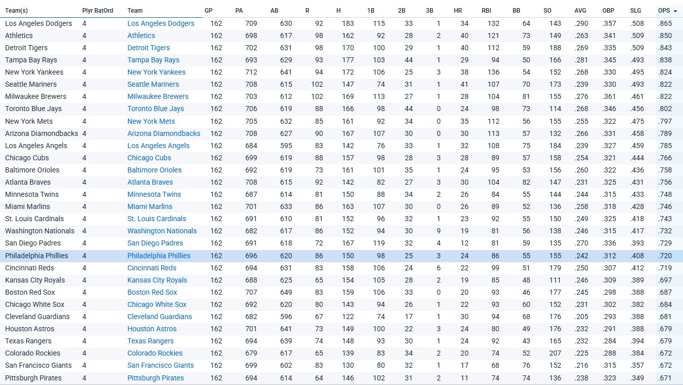 That might have improved their 20th-ranked OPS among four-hole hitters across the league, which was .720. The Athletics, Rays, Diamondbacks, Angels, Orioles, Braves, Twins, Marlins, and Nationals all ranked higher: