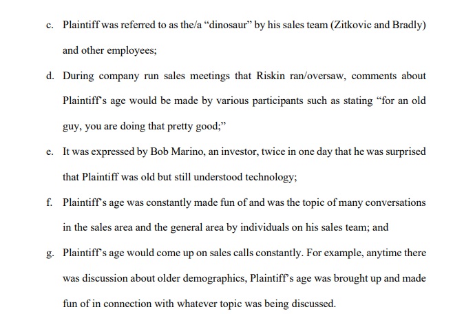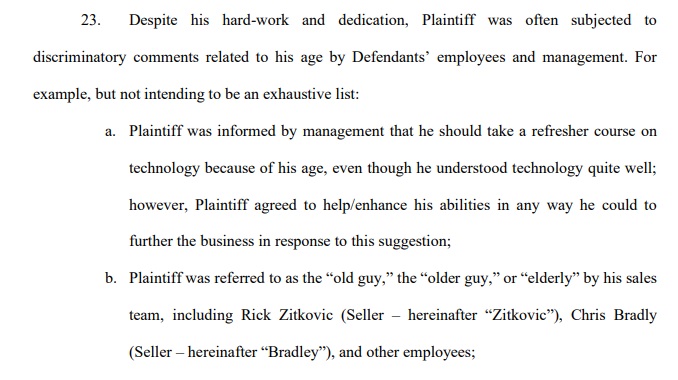 The filing further alleges that Geltman was replaced by a member of his sales team who was 20 years younger.