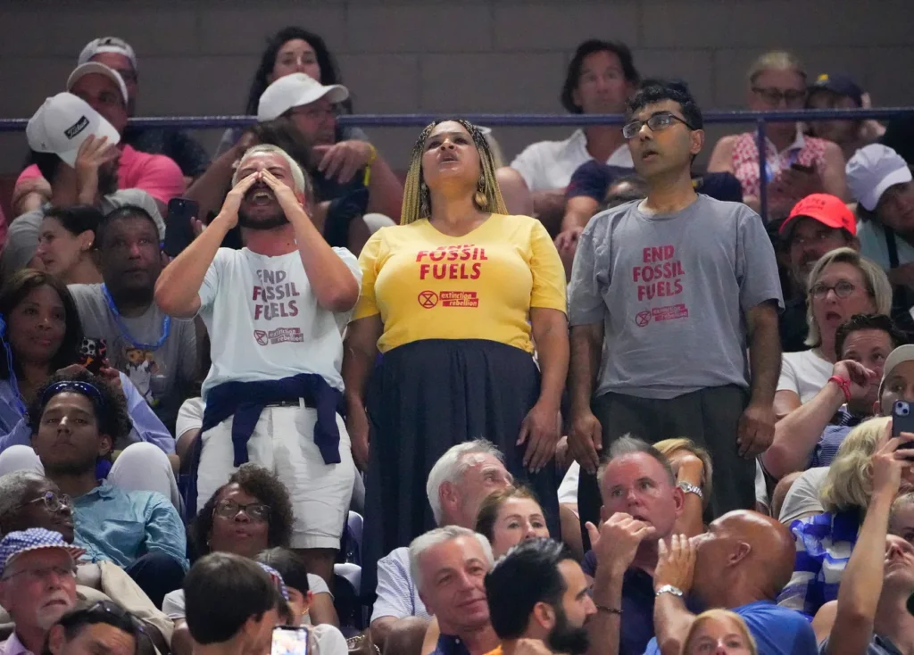 They have been shouting “no tennis on a dead planet”, “end fossil fuels”, and “JP Morgan we have a right to our future in too”.