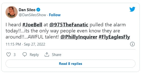 The background is that Joe Bell once fired Dan Sileo, who currently hosts The National Football Show for JAKIB Media. This goes back 10 years, to when Bell, who is now the Beasley VP and Market Manager in Philadelphia, was doing the same gig in the Miami region. Sileo was one of his hosts on Sports Radio 560 WQAM, and was suspended and later canned for tweeting inappropriate things at Erin Andrews, which was documented by Awful Announcing at the time:
