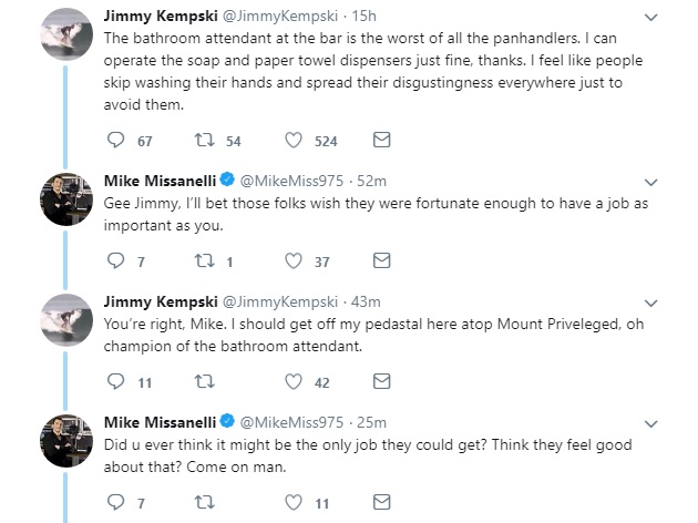 So hopefully this one is more to your liking. It’s a Twitter exchange between Philly Voice’s Jimmy Kempski and Mike Missanelli over the usefulness of the bathroom attendant and whether or not that person is even necessary.