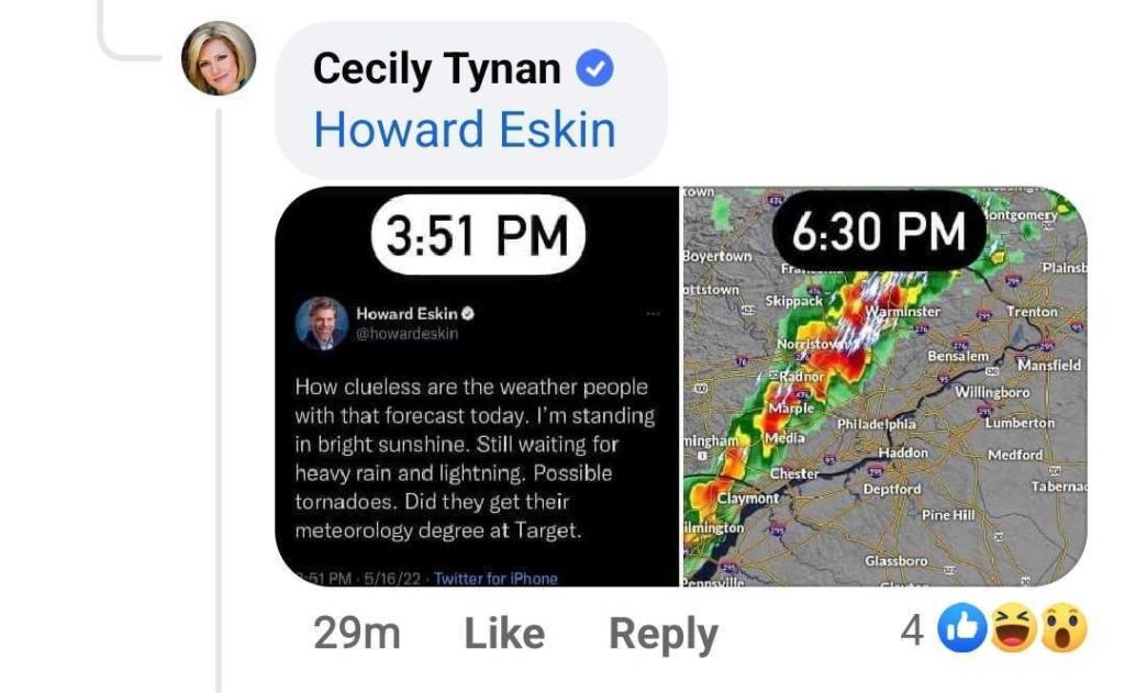 In one corner, it’s Howard “The King” Eskin of Sports Radio 94 WIP, who went on Twitter to rip meteorologists-at-large after Monday’s storms turned out to be not as bad as originally thought: