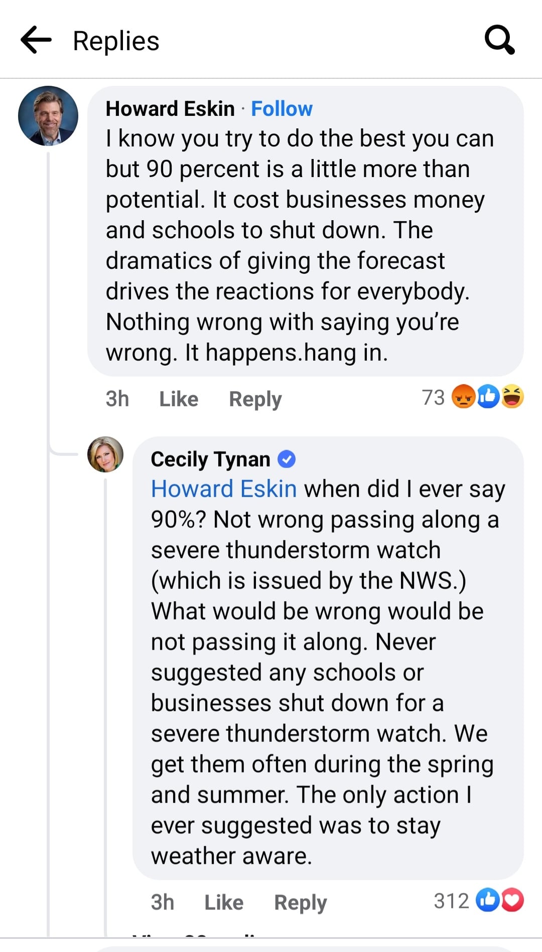 But “The King” didn’t stop with a Twitter post. He was out for meteorological blood, and ventured over to Cecily Tynan’s Facebook page to write this:
