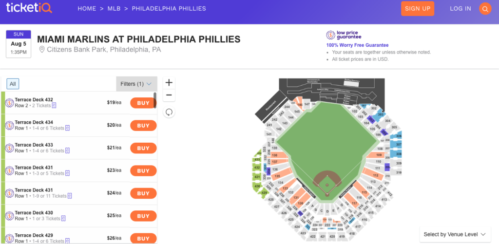 There’s nothing like a Sunday out with friends and family for an affordable price. The best deal of the day is two tickets in Section 432 Row 2 for only $19 each. This deal, along with the others pictured, are backed by Ticket IQ’s “Low Price Guarantee”.