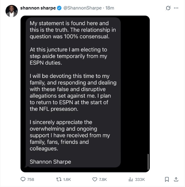 Shannon Sharpe issued this statement Thursday afternoon in response to the $50 million rape lawsuit filed against him: